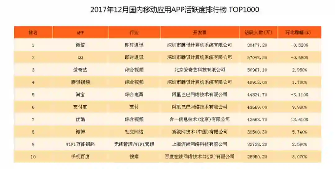 上图为某机构公布的 2017 年 12 月国内 App 活跃度的数据。可见最 hot 的 App,它的行业划分不是搜索。搜索已经内化为 App 内部生态的基础服务和能力。