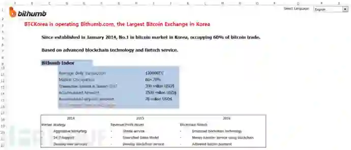 另一个恶意宏文档为bithumb.xls,它伪装为比特币交易公司Bithumb的内部文档,该文档被压缩在 Bithumb.zip中,并和名为“About Bithumb.pdf“的诱饵文档一起被发送:
