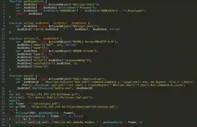 在11月,攻击者以加密货币交易所Coinbase、Bithumb和Falcon Coin为主题的恶意ZIP文件,感染攻击特定目标人物。这些恶意文件中都包含了通过JavaScript加密混淆器编码的一个JavaScript downloader程序,程序逻辑非常简单,首先,从 hxxp://51.255.219[.]82/ theme.gif获取一个PowerRatankba.B下载脚本,然后保存到 C:\Users\Public\Pictures\opt.ps1中等待执行。下图为编码混淆的 falconcoin.js脚本: