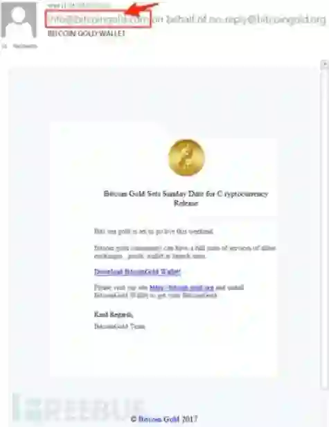 其中一例攻击样本为,伪装为比特币黄金(BTG)钱包应用,和假冒恶意网站hxxps://xn—bitcoingld-lcb[.]org/,邮件内容中又内置了一个与合法比特币黄金官网(https://bitcoingold.org/)相似的恶意网站hxxps://bitcoingöld[.]org,注意后面网站字母o上多了两点ö。钓鱼邮件发件地址为 info@xn—bitcoingod-8yb[.]com、info@xn—bitcoigold-o1b[.]com 和tech@xn—bitcoingld-lcb[.]org。