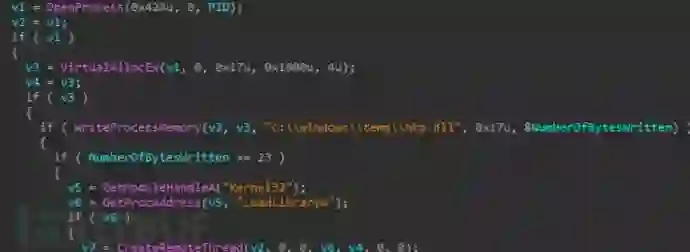 RatankbaPOS在执行进程注入时,首先会对进程列表创建一个CreateToolhelp32Snapshot快照,然后其dropper/injector会在其中搜索名为xplatform.exe的进程,如果有匹配进程,则会对该进程创建一个模块列表快照TH32CS_SNAPMODULE,然后使用Module32First和Module32Next迭代已加载的模块,同时通过向任何大写字母添加0x20将其转换为小写字母的方式,搜索对比目标线程为韩国KSNET POS产品的ksnetadsl.dll,如果匹配成功,则返回 xplatform.exe 进程号PID。最终,RatankbaPOS将以c:\ windows \ temp \ hkp.dll形式写入磁盘,而hkp.dll将会注入到进程xplatform.exe中。