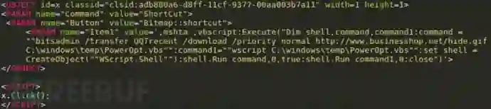 这些恶意CHM文件都使用了短地址来执行相应恶意代码,并配合两种技术方式来获取远程Payload。第一种方式为使用VB脚本和BITSAdmin工具,首先从远程地址 hxxp://www.businesshop[.]net/hide.gif 获取下载脚本,之后,该下载脚本被保存为C:\windows\temp\ PowerOpt.vbs,一旦此脚本被执行,将会从远程地址hxxp://158.69.57[.]135/theme.gif下载PowerShell命令,并保存为 C:\Users\Public\Pictures\opt.ps1,以实现PowerRatankba加载。下图为CHM文件中的PowerRatankba downloader VB脚本:
