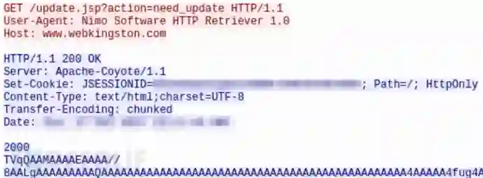 RatankbaPOS首先通过进程注入方式实现系统植入和持久化驻留,它会自动搜寻POS终端进程并完成数据窃取。一开始,它会创建注册表 HKEY_LOCAL_MACHINE\SOFTWARE\Microsoft\Windows\ CurrentVersion\Run\igfxgpttray以实现持久化驻留,然后以”Nimo Software HTTP Retriever 1.0”为 User-Agent 信息,向硬编码URLhxxp://www[.]webkingston[.]com/update.jsp?action=need_update发起HTTP命令请求,实现管理控制。如果C&C端无回应,则RatankbaPOS会进行进程注入。下图为RatankbaPOS与C&C端的数据请求: