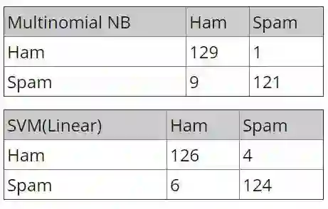 这里我们的测试集中包含 130 封垃圾邮件和 130 封非垃圾邮件,如果你已经顺利完成了之前的所有步骤,那么你将会得到如下的结果。这里显示的是两个模型在测试数据中的混淆矩阵,对角元素代表了正确识别的邮件数,非对角元素代表的则是错误的分类。