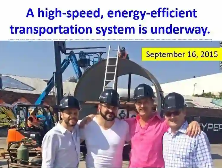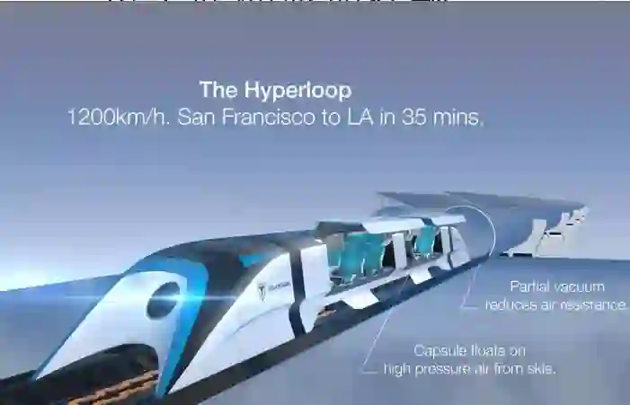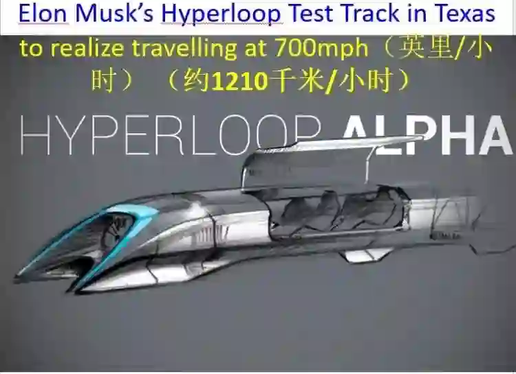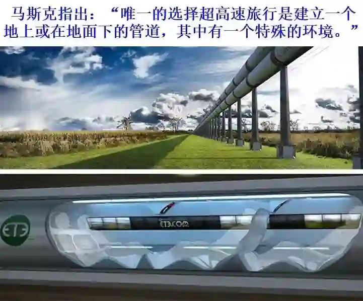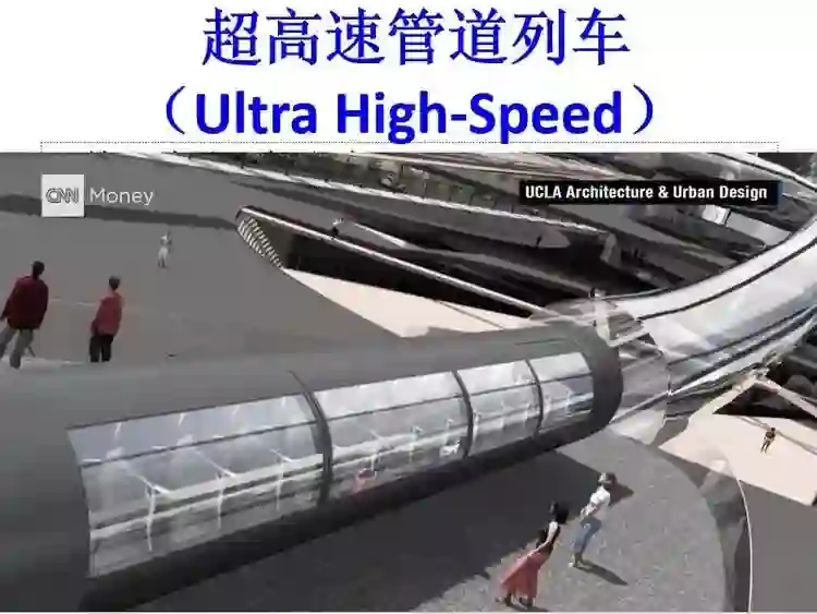 美国的特斯拉和空间探索技术公司的CEO埃隆.马斯克将其命名为“超级高铁”(Hyperloop),这种真空管道运输的交通工具像一个“胶囊”,每一个胶囊被放置于真空管道中,利用太阳能,像炮弹一样被发射至目的地,目前是每小时1000公里(由于在近乎真空环境,速度有大幅提高可能,设想将来时速每小时达4000公里以上),并将是新的城市景观。现在正在加紧施工中!