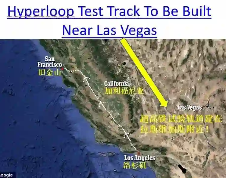 规划中的超级高铁从旧金山到洛杉矶仅需35分钟。先在洛杉矶附近建立超级高铁的试验场。