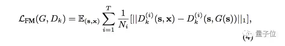 将鉴别器Dk第i层的特征提取器表示为D(i)k,特征匹配损失函数可以表示如下: