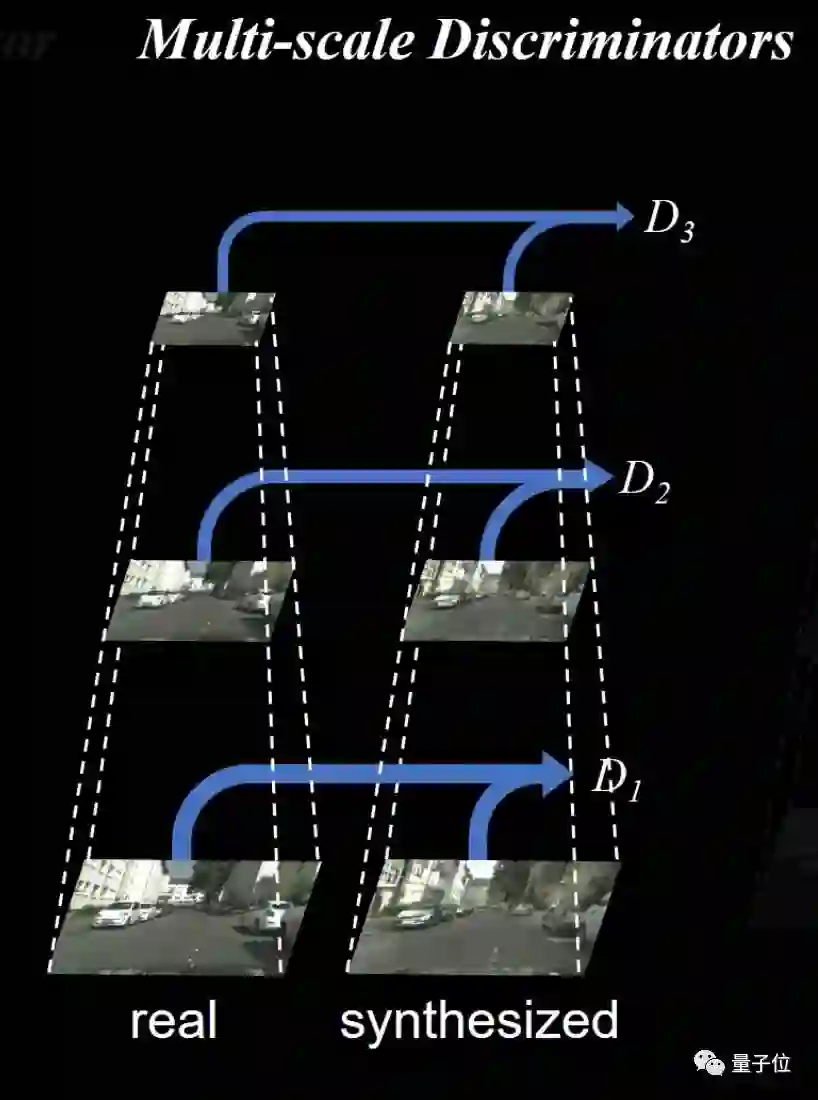 跟生成器抢内存?不行不行。于是这篇论文的作者们提出了一种新思路:多尺度鉴别器,也就是用3个鉴别器,来鉴别不同分辨率图片的真假。