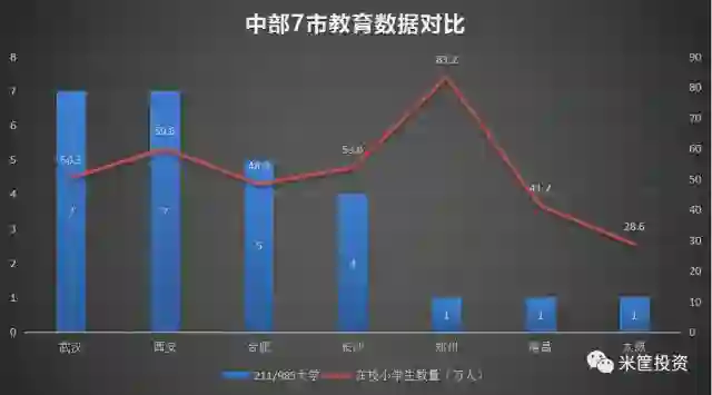中部7市的211/985大学数量对比中,武汉、西安均有7所,合肥5所,这三个城市都有“科教之城”的标签,仅位于北京、上海之后,其科教实力不容小觑。