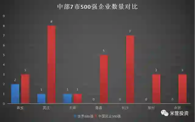 6、世界500强数量,中部城市表现都比较差,最多的西安也不过2家,武汉、太原各1家。南昌、长沙、郑州、合肥均没有企业上榜。