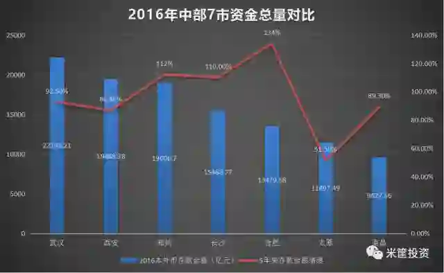 资金总量代表着一个城市的存量财富。整体看,武汉独超2万亿元领跑,西安、郑州均为1.9万亿元。长沙、合肥则相对较弱。