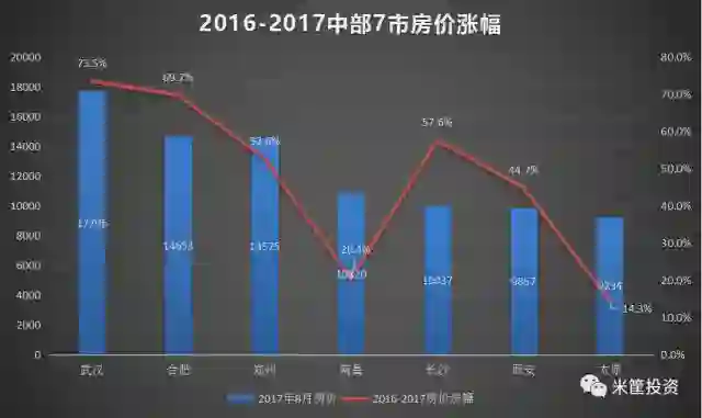 始于深圳的2016年房价暴涨,也带动了一二线城市,当然也包括中部城市。武汉、合肥的涨幅都在70%左右(数据限制,实际涨幅要更高),郑州、长沙涨幅也超过了50%。