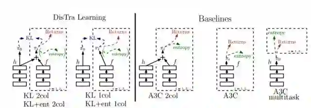图 2: 不同算法和基线的描述。左侧是 Distral 算法中的两个,右侧是 3 个 A3C 基线。熵(entropy)在括号之内,因为它是可选择的,且只用于 KL+ent 2col 和 KL+ent 1col。