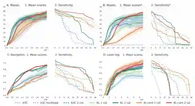 图 4:上图 A1、C1 和 D1 展示了任务具体型(分别为迷宫、导航和 laser-tag 任务)策略性能(所有任务的均值),其中这几幅图 x 轴代表每个任务训练环境步的总数。B1 图展示了由使用提取策略(distilled policies)所获得的均分值。对于每个算法,我们基于曲线下面积展示了最优超参数设定。A1、B1、C1 和 D1 中的粗线为四次运行的均值,而彩色的区域为每个任务的平均标准差。图 A2、B2、C2 和 D2 展示了每个算法 36 次运行的最终性能,并且从好到坏排序(9 个超参数设定,且运行了四次)。