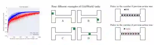 图 3: 左图:两个空间网格世界中的学习曲线。DisTraL 智能体(蓝色)学习的更快,并向更好的策略收敛,从整体上证明了更稳定的学习。中图:任务的实例。绿色代表目标位置,为了每一任务统一被采样。在每一个 episode 开始之时,开始位置统一被采样。右图:习得的提取策略 π0 只在走廊之中,并受限于之前向左/向右的行动,没有先前的奖励。箭头的大小描述行动的概率。注意向上/向下行动的概率可以忽略。模型在走廊中学习保持行进的方向。