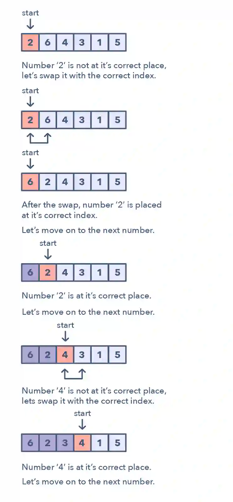 循环排序模式描述了一种处理涉及包含给定范围内的数字的数组问题的有趣方法。其一次遍历数组一个数字,如果正在迭代的当前数字不是正确的索引,则将其与正确索引处的数字交换。