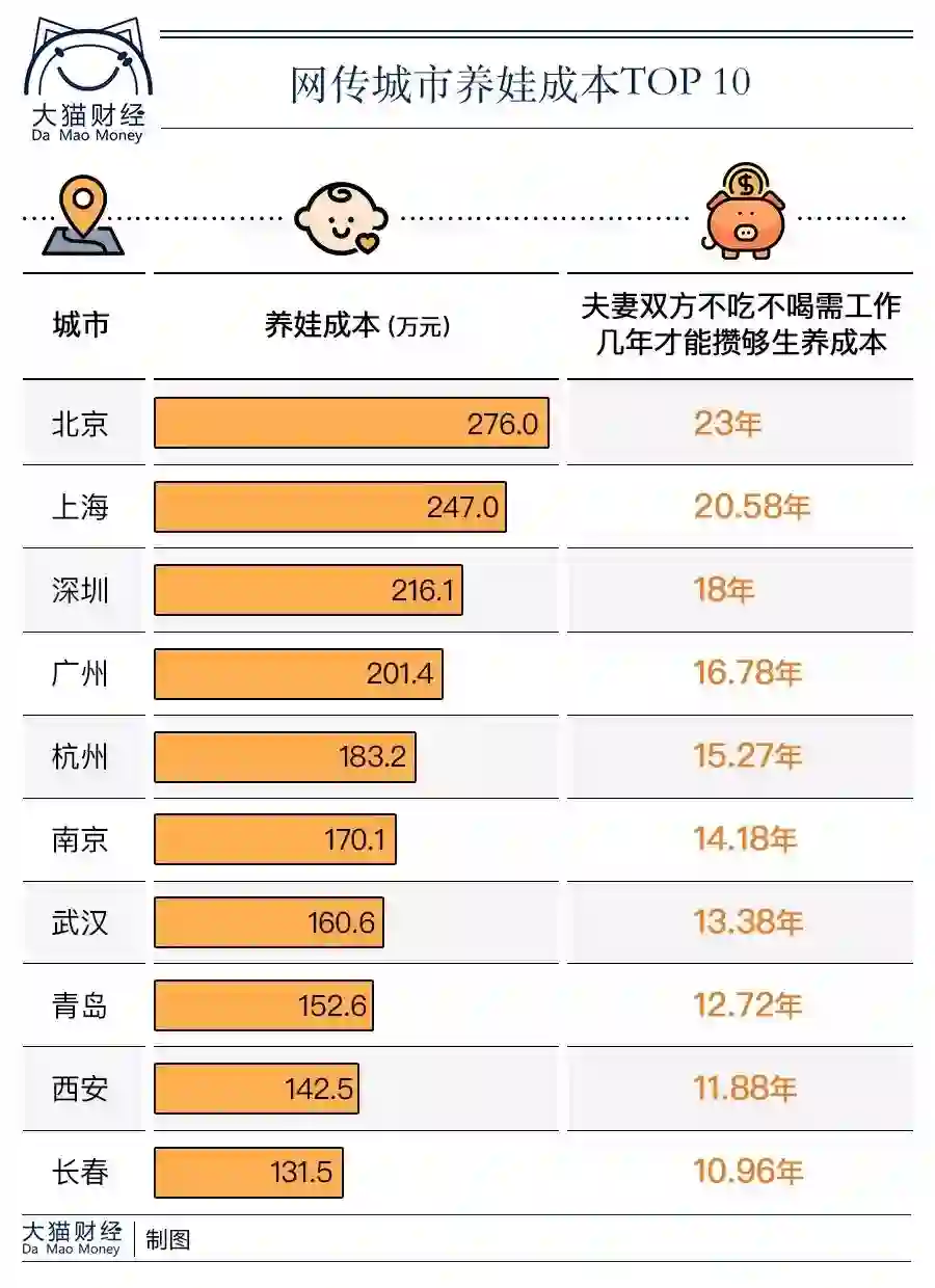 猫哥看到一个大中城市养娃的成本调查,top10的排名是这样的: