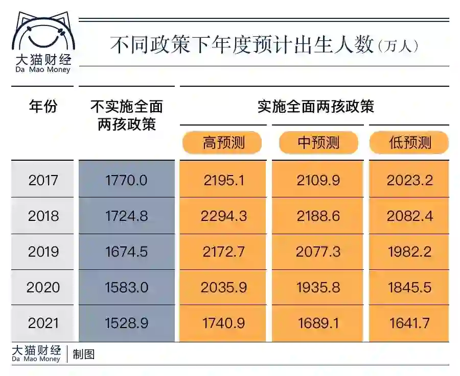 而此前国家卫计委估计,实施二孩政策应该能够带来一波人口生育高峰,2017年的预估出生人数最低预测也在2013万,但是现实情况我们也看到了,实际出生人口没有达到最低预测,甚至不及”不实施全面二孩政策“的预估出生人数。