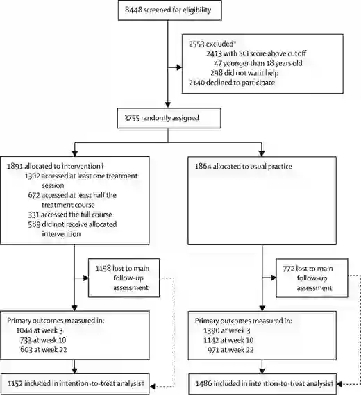 总共有3700名受测者参与了研究,他们被随机分为两组,一组受测者接受6次在线的CBT治疗,每次20分钟,这种治疗的目的是解决失眠问题,而另一组受测者则不接受治疗。在研究开始时和3周、10周和22周之后,两组的受测者们都接受在线问卷调查。
