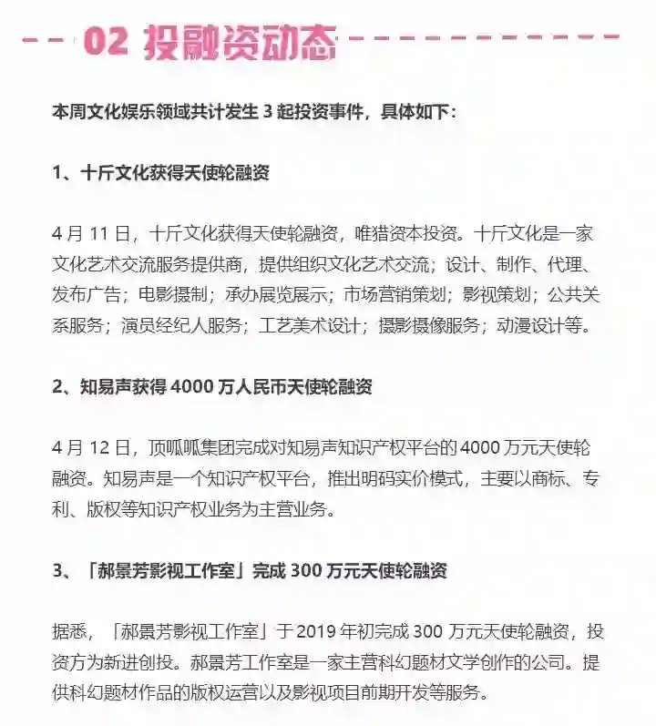 以下是 4 月 11 日至 4 月 17 日,IT 桔子文娱周报全文: