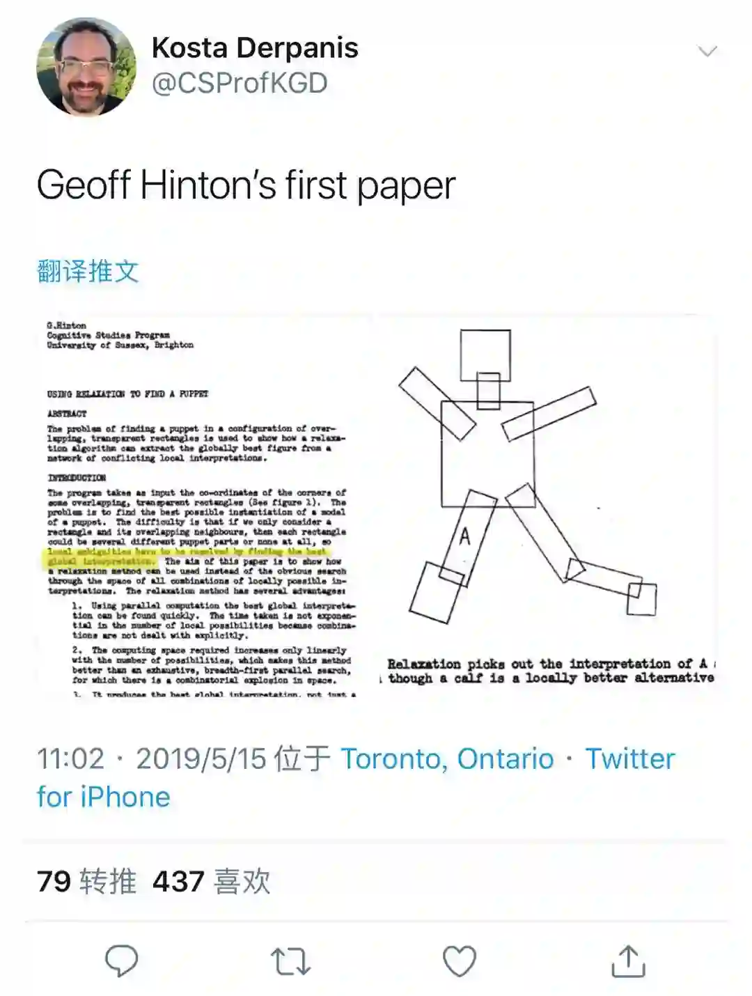 当然,让大家激动的并不是源自对“大神”科研处女作的好奇,也不是提出的算法有多么颠覆,而是Hinton 这位AI界的人形自走教科书,早在40年前这篇论文中,就提出了“让AI具备空间感”的松弛算法,解题思路与2017年其提出的“胶囊网络”不谋而合。
