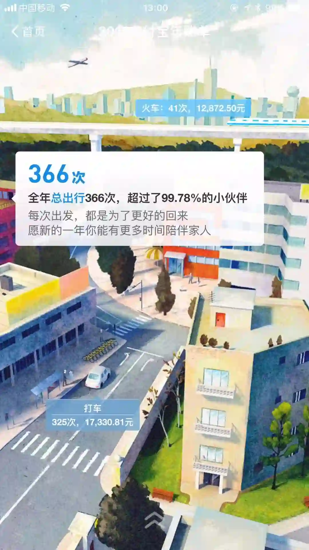 比如描述出现数据,支付宝的H5页面上有火车、飞机,出租车等元素,文案是“每次出行,都是为了更好的回来。愿新的一年你能有更多时间陪伴家人”。整个画面和文案的组合,会让人觉得很温暖。