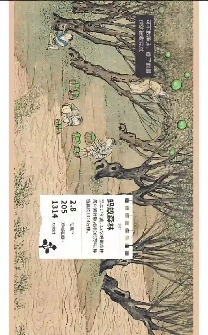 这个长图主要讲的就是支付宝2017年的年度账单,采用模仿清明上河图的风格来展现,介绍了包括蚂蚁森林、收钱码、信用免押等产品取得的成绩以及对人们生活的改变。不论是从创新性,还是从趣味性上来说,都是一个非常经典的公司角度的年终数据盘点案例。