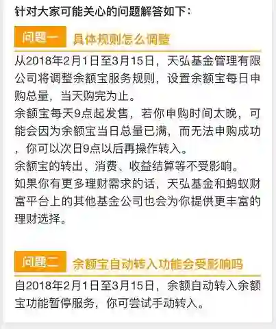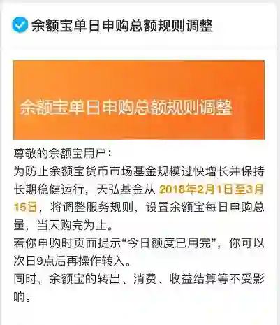 自2018年2月1日起,天弘基金调整了余额宝服务规则,余额宝正式开始“限购”,官方设置了每日申购总额,也就是说,拥有3亿用户的庞大货币基金,不是你想买就能买的了。