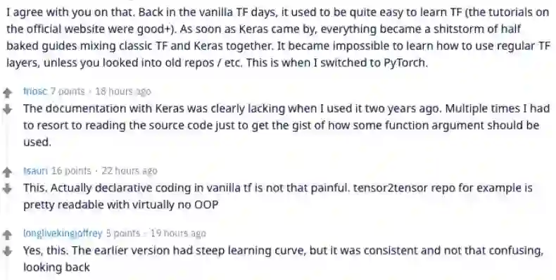 一位网友写道:「在过去 TF 的黄金时期,有很多容易上手的教程,官网上的教程质量也很高。但是自从 Keras 被引入后,整个指引文档成了 Keras 和经典 TF 的混合。」这段评论得到了很多人的赞同。一些人表示,TF1.x 版本尽管学习成本很高,但是(教程)是非常连贯的,况且还有 tensor2tensor 这样的代码库,使得旧版本的使用并不是那么困难。