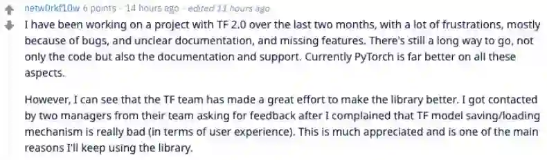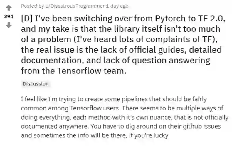 切换之后,TF 2.0 给他的最大感觉是:这个库本身没有什么问题,真正的问题在于缺乏官方指南、详细的说明文档以及来自官方开发团队的答疑。