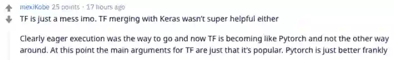 一些网友认为,TF2.0 还有一个不好用的地方,那就是 Keras 和 TF2.0 的「联姻」。上图的这位就表示,eager 模式的确是 TF 版本更新迭代的正确方向(毕竟去掉了 session 这个万恶之源,支持动态图),但是引入 Keras 却让 API 又变得更混乱了。现在人们有多种构建模型的方法:tf.keras、tf.function 等等。
