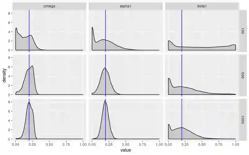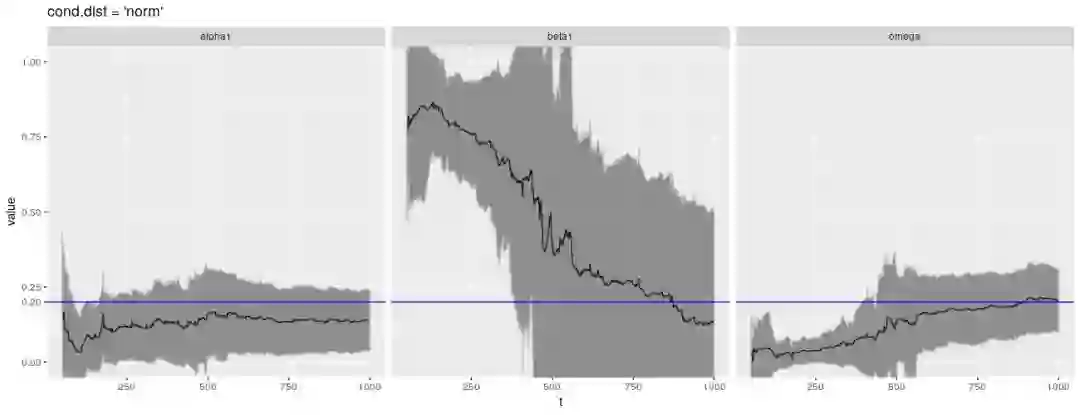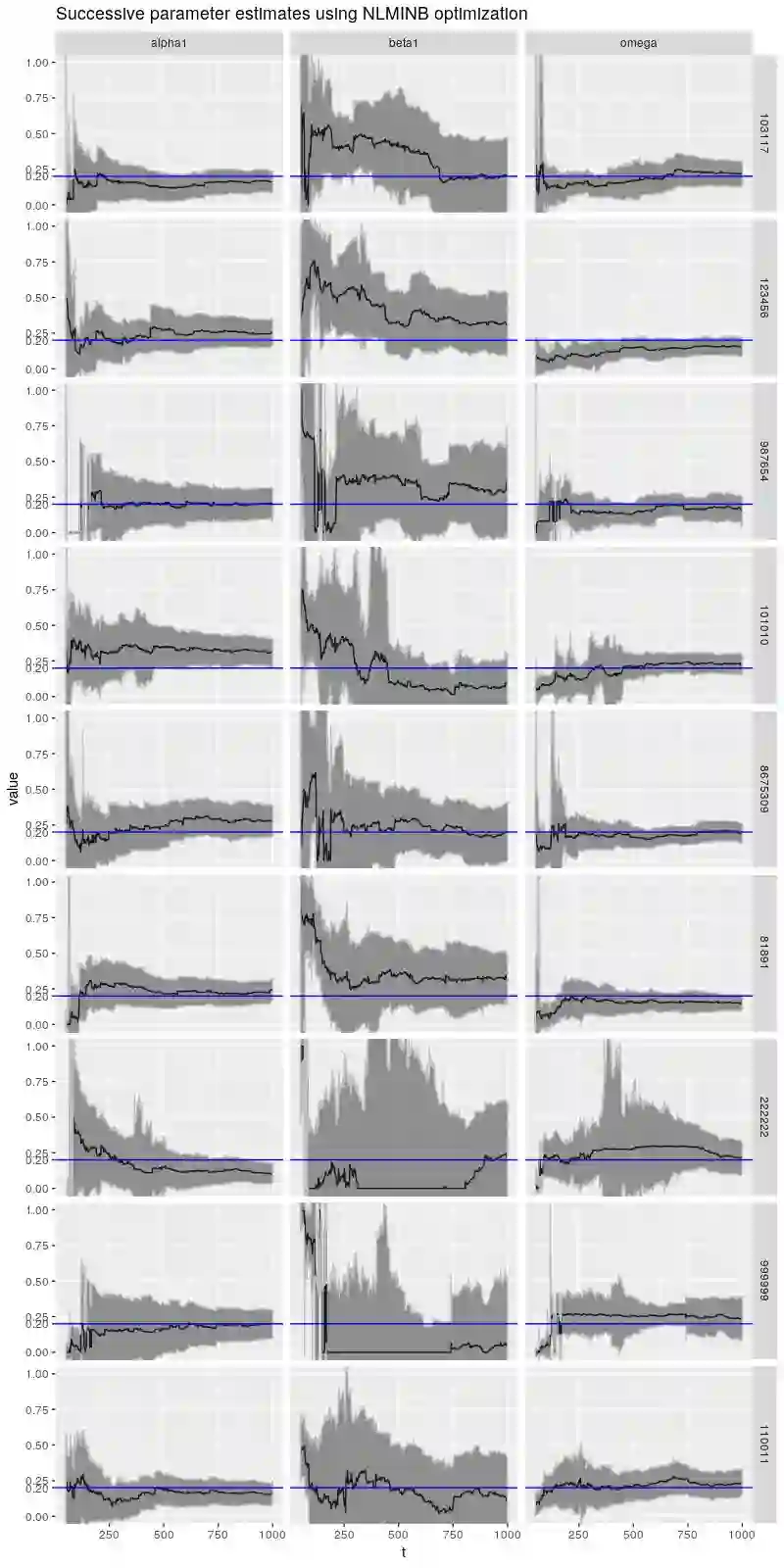 当样本量为 100 时,这些估计远非可靠。ω和α以一种令人不安的倾向趋近于 0,而β几乎可以说是任何东西。如上所述,garchFit() 报告的标准差不会捕获这种行为。对于较大的样本量,ω和α表现得更好,但β仍显示出令人不安的行为。它的变化幅度几乎没有变化,并且它仍然有过小的倾向。