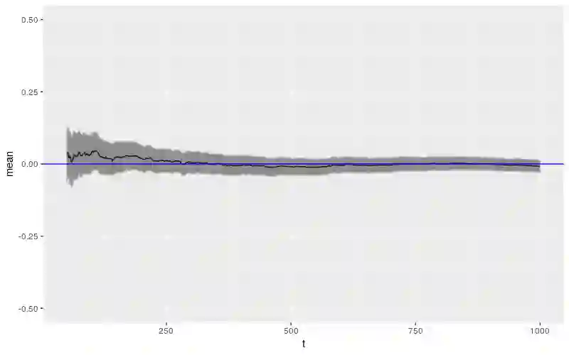 所有这些实验均在固定(但随机选择)的序列上进行。实验显示,对于样本量小于 300(可能更大的数字)的情况,GARCH(1,1)参数估计的分布是可疑的。当我们模拟许多过程并查看参数的分布时会发生什么?