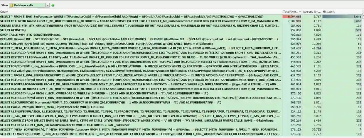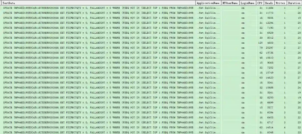 最后不得已放弃工具,转而选择使用sql server profiler去监控sql语句耗时。一跟踪不要紧,问题就直接暴露了,整个全屏的重复sql语句,如下图。