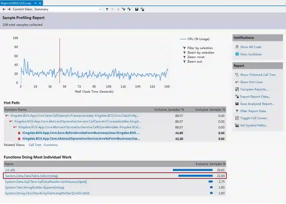其中第1、4条大致说明程序I/O消耗大,第一代的GC上存在未及时释放的垃圾占比过高。而根据上图的采样结果,我们可以直接看出是由于再代码中频繁操作DataTable引起的性能瓶颈。走读代码发现的确如此,所有的数量统计都是在代码中循环遍历DataTable进行处理的。而最终的优化策略,就相当于一次大的重构,将所有代码中通过遍历DataTable的计算逻辑全部挪到SQL中去做。由于代码过多,就不再放出。