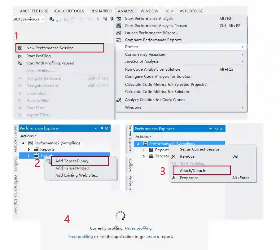 这次我选用的时VS自带的Performance Profiler,开发环境下极其强大的性能调优工具。针对我们当前案例,我们仅需要跟踪指定服务对应的dll即可,使用步骤如下: