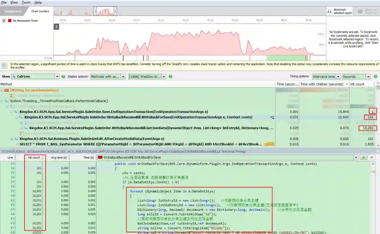 同样,我们还是先尝试本地重写。经测试批量引入101张单据,就耗时5mins左右。下一步打开Sql监控工具也未发现耗时语句。但考虑到是批量导入操作,虽然单个耗时不多,但乘以100这个基数,就明显了。下面我们就使用RedGate的Ants Performance Profiler跟踪一下。