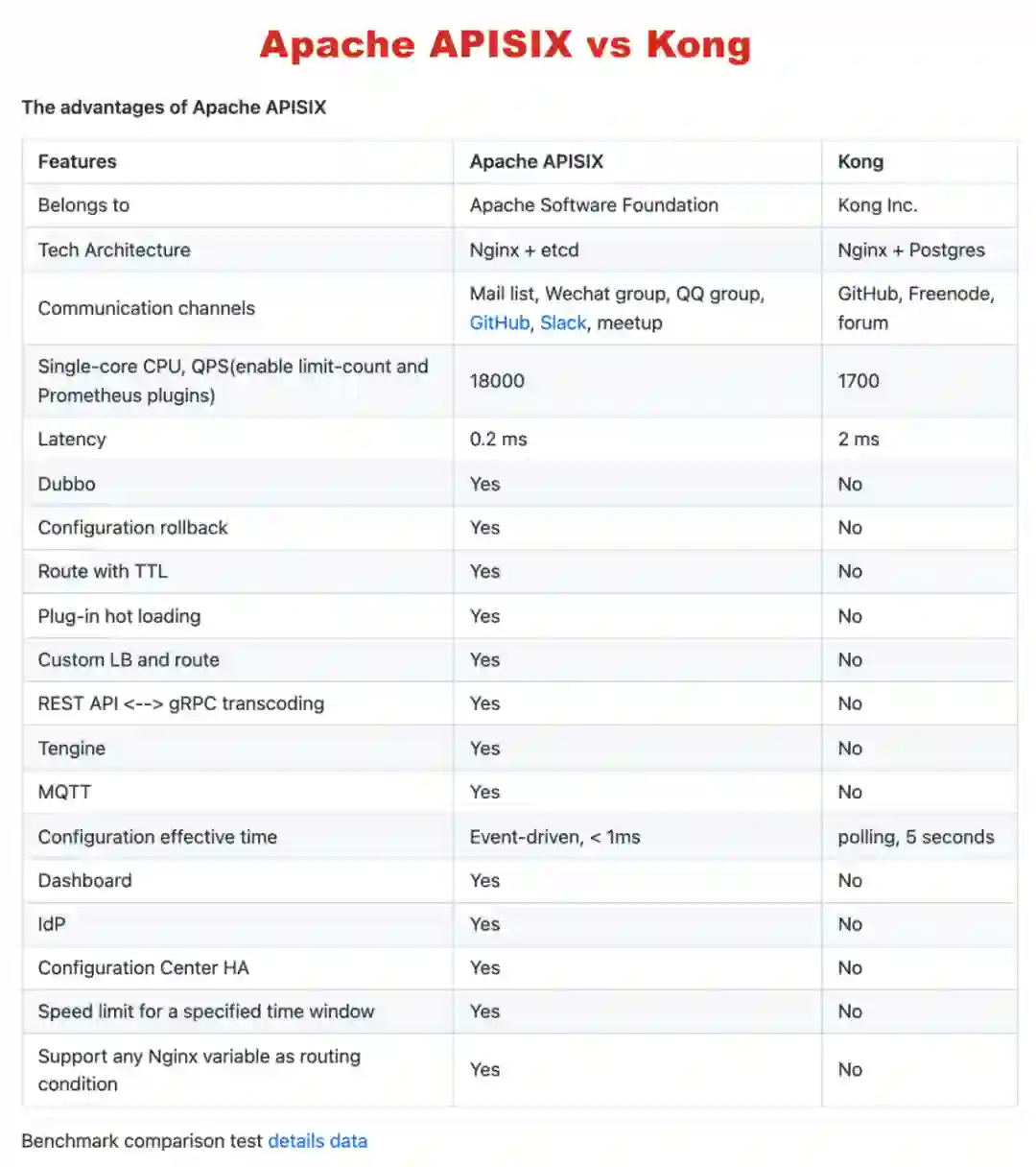 进一步调研时,我们发现了 Apache APISIX。首先 Apache APISIX 的性能比 Kong 强,在 Apache APISIX 的 GitHub Readme 中有个非常详细的对比图,列出了两者的性能测试差距,这与我们自己测试下来的数据基本一致。