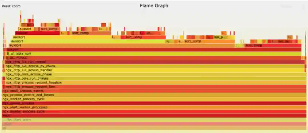 在 CPU 升高现象上,通过火焰图可以明显看到大部分 CPU 的时间都是划在 auxsort上,它是由 FUNCC 触发。而 FUNCC 的触发也指明了一个问题,就是证明相关数据没有经过 LuaJIT,只有图中最右侧的一小部分处理了正常请求。