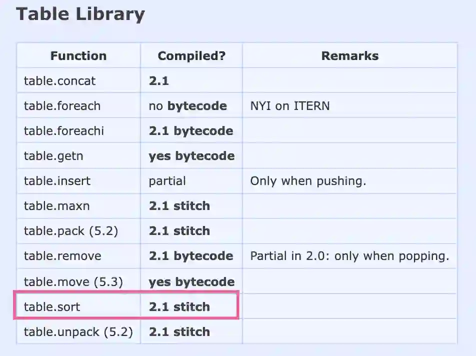 出现这种现象的原因主要是 LuaJIT 的table.sort不是完全依靠 JIT 模式,这点可以在 LuaJIT 官网 wiki 中看到相关说明,所以在 Lua 代码环境中使用table.sort 效率是比较低的。