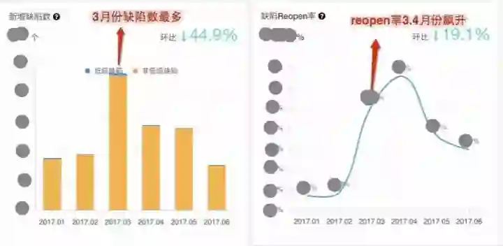 缺陷的数量下降,reopen率下降,线上发布成功率上升,质量在好转。
