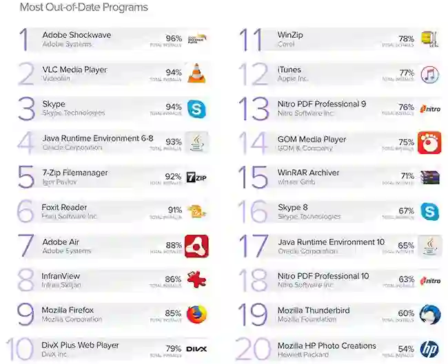 安全公司 Avast 的报告《PC Trends Report 2019》(PDF)显示, PC 上安装的应用程序有 55% 是旧版本,还有极少数应用九成以上都是旧版本,如 Adobe Shockwave (96%)、VLC Media Player (94%) 和 Skype (94%)。VLC 是开源多媒体播放器,已经相当成熟,除了安全更新外,旧版本新版本之间的差异很小。报告分析了从 1.63 亿设备上收集的匿名化数据,发现 Windows 10 的安装比例达到 40%,接近 Windows 7 的 43%。但 15% 的 Windows 7 用户 9% 的 Windows 10 用户使用的是旧的已经停止支持的版本,如 2009 年发布的 Windows 7 Release to Manufacturing 和 2017 年发布的 Windows 10 Spring Creators Update。