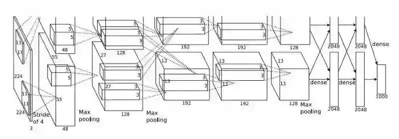 这个计算过程看起来确实有点吓人。这是因为网络由两半组成,每一部分都在两块不同的GPU上进行训练。我们把这个过程说的容易点,用一个精简版的图来说明这个问题: