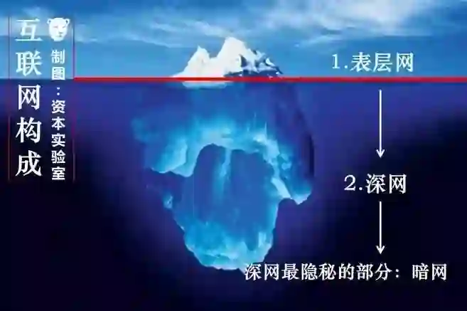 这张图试图向我们说明:普通人所能访问到的表层网络仅仅只是整个互联网的冰山一角;而绝大多数人不知道,或者不具备访问能力的深层网络,比表层网大了好几个数量级;深网占据了整个互联网信息和数据的96%。