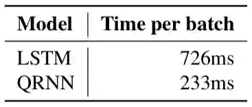 我们的基础架构基于Merity等人使用的模型,该模型中有一个可训练的嵌入层、一个或多个层叠式循环神经网络和一个Softmax分类器。在Merity等人的论文中,他们评估了两个不同的循环神经网络:LSTM和QRNN。在性能方面,LSTM更胜一筹;而QRNN更能提高GPU的利用率:它用卷积层处理输入的数据,然后在跨通道中应用一个极简的循环池化函数。由于卷积层不依赖之前的输出,因此所有的输入处理都可以分成单个矩阵乘法。虽然循环池化函数是连续的,但它是基于元素的快速操作,要被用于现有的已经准备好的输入上,因此几乎没有任何额外成本。