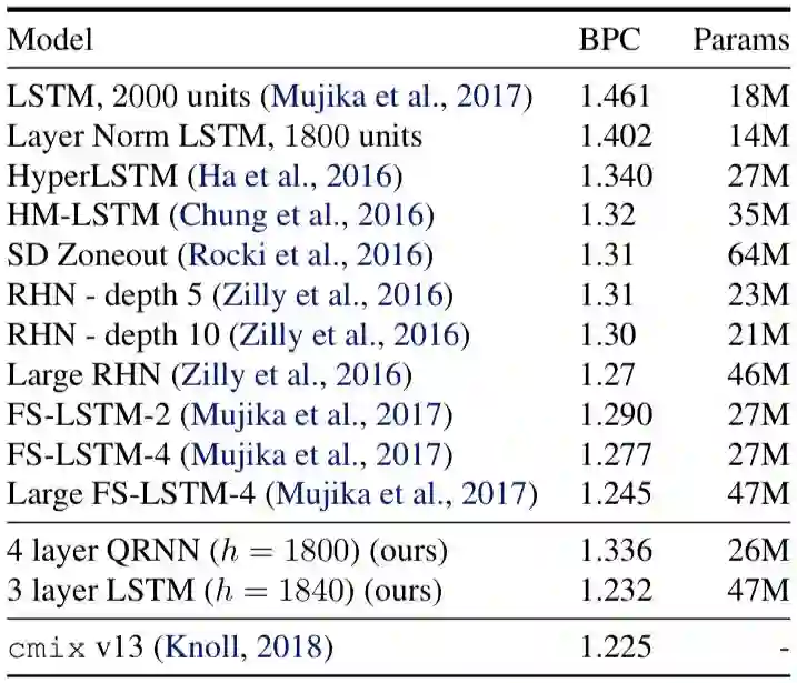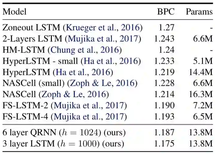 Hutter Prize Wikipedia数据集(即enwik8)是一个字节级数据集,有维基百科XML转储的前一亿字节组成。在该数据集上,模型使用了三层LSTM,BPTT的长度为200,嵌入尺寸400,隐藏层尺寸为1850。最终实验结果如下: