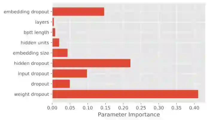 如果神经语言模型中的超参数数量较多,那么模型在应对新数据集时的调整是非常费时费力的。为了研究超参数的重要性,我们用随机参数训练了200个模型,然后用随机森林MSE对其进行回归。随机森林的特征重要性就代表了超参数的重要性。