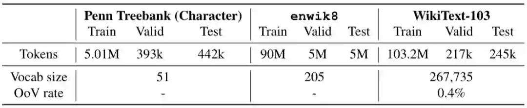 试验在三个数据集上进行,两个字符级数据集(Penn Treebank和enwik8),一个大型单词级数据集(WikiText-103)。